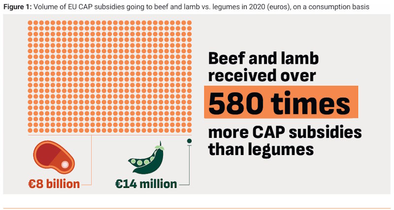 En 2020, la Unión Europea asignó alrededor de 8.000 millones de euros de fondos de la Política Agrícola Común (PAC) a la producción de carne de vacuno y ovino con altas emisiones. Por lo tanto, sólo 14 millones se destinaron a legumbres, como lentejas y judías. 580 veces más para la carne y el cordero en comparación con las proteínas vegetales de bajo impacto.