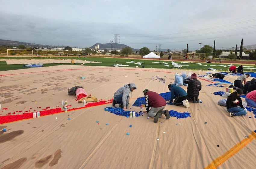 El mosaico cubrió 1,203 metros cuadrados (12,900 pies cuadrados) y fue ensamblado a principios de este mes a partir de más de 1 tonelada de tapas de botellas de plástico en una cancha de fútbol en el estado de México, en las afueras del área metropolitana de la Ciudad de México.