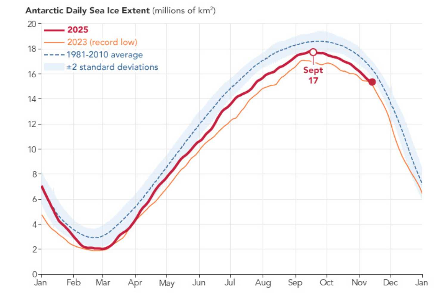 Desde antes de 2016, la Antártida ha experimentado varios inviernos récord o casi récord. Entonces algo cambió. Los últimos años han mostrado valores persistentemente bajos, con fuertes fluctuaciones que complican las previsiones. Walt Meier, científico del NSIDC, afirma: «Aún no está claro si la reducción de la capa de hielo en la Antártida persistirá. Por ahora, estamos vigilando esto».