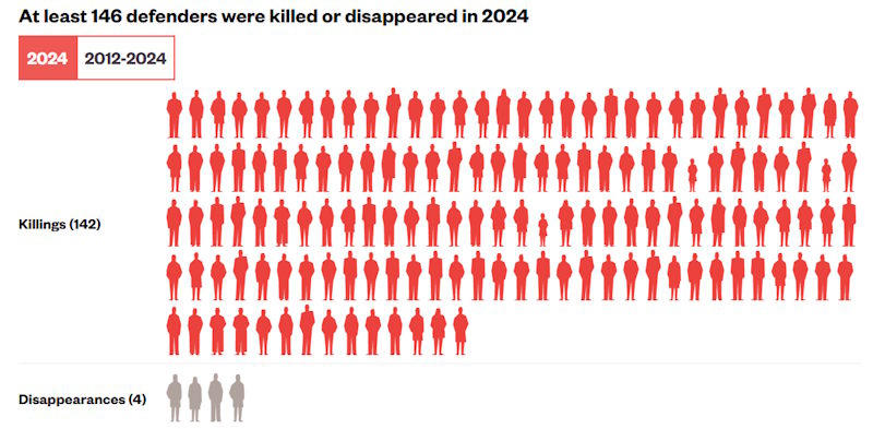 Al menos 146 defensores de la tierra y el medio ambiente fueron asesinados o desaparecidos en todo el mundo el año pasado para defender sus tierras, sus comunidades o el medio ambiente.