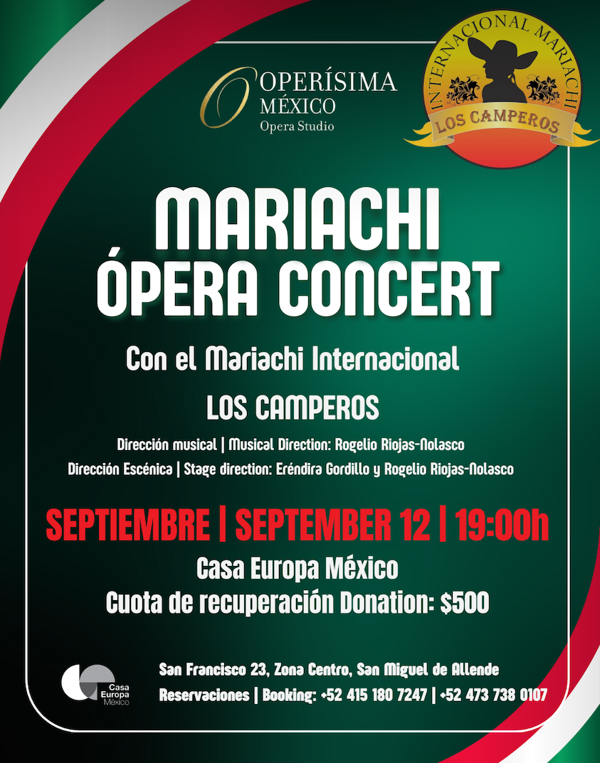 Antes de las celebraciones del Día de la Independencia, los cantantes internacionales de mariachi internacionales se unen a Operísima México para traerle una fusión mágica de mariachi y ópera. Prepárese para una noche inolvidable bajo la dirección musical y escénica del maestro Rogelio Riojas-Nicolasco y Maestra Eréndira Gordillo. Este concierto promete un viaje sónico que moverá a la audiencia profundamente, combinando el drama operístico con la pasión mexicana.