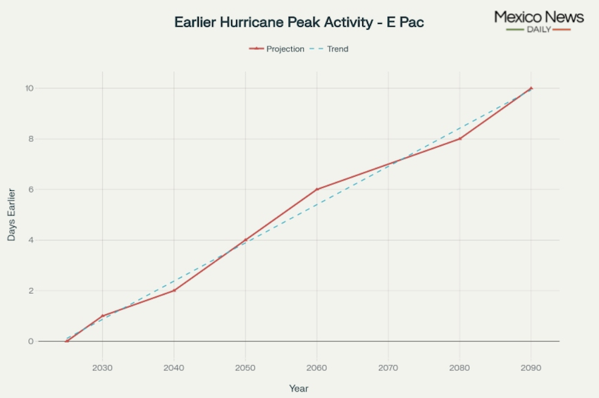 Esta tendencia se identificó en un artículo de 2023 en Naturalezaque señaló «un avance estacional significativo de TCS intensos (ciclones tropicales) desde la década de 1980 en la mayoría de los océanos tropicales, con tasas de cambio anteriores de 3.7 y 3.2 días por década para los hemisferios norte y sur, respectivamente». De hecho, para el año 2090, la actividad de la tormenta máxima habrá aumentado en un estimado de 8 a 10 días.
