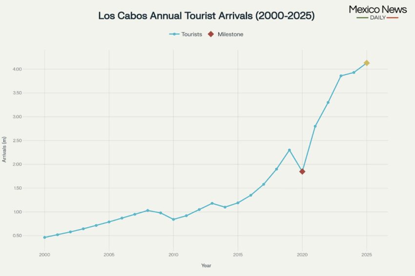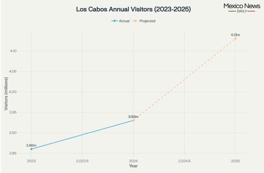 Utilizo la palabra impresionante porque si Los Cabos cumple con los 4.13 millones de turistas proyectados, está en ritmo de recibir este año, un resultado muy probable, considerando que ya está a la mitad de allí, entonces no solo habrá aumentado el número de turistas en un 5% de los 3.93 millones Eso llegó en 2024 y el 7% de los 3.86 millones en 2023, pero habrá establecido un nuevo récord para los visitantes anuales al destino por cuarto año consecutivo.